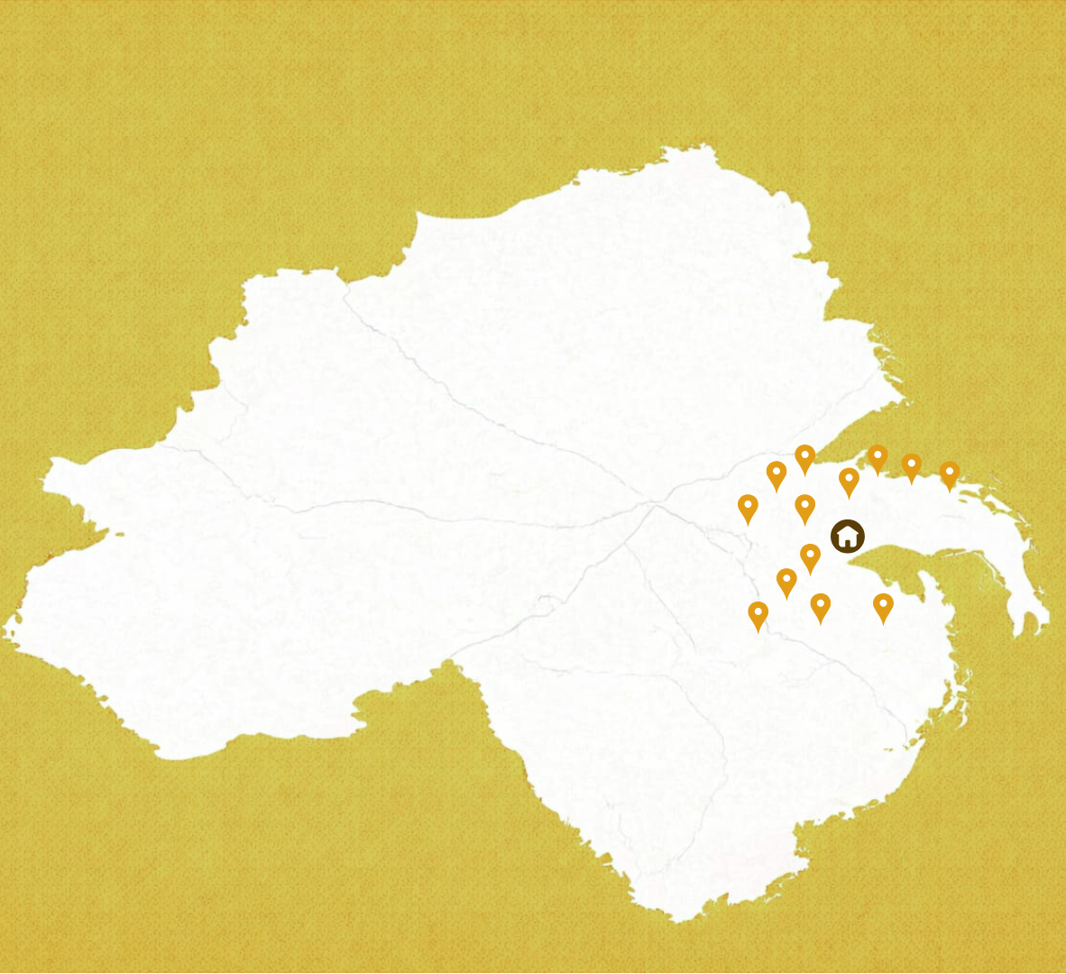 Bangor, Newtownards, Comber, Dundonald, Holywood, Cultra, Belfast, Lisburn, Donaghadee, Millisle, Groomsport, Ballynahinch, Ballyhalbert, Ballywalter, Ballygowan, Carryduff, Downpatrick.